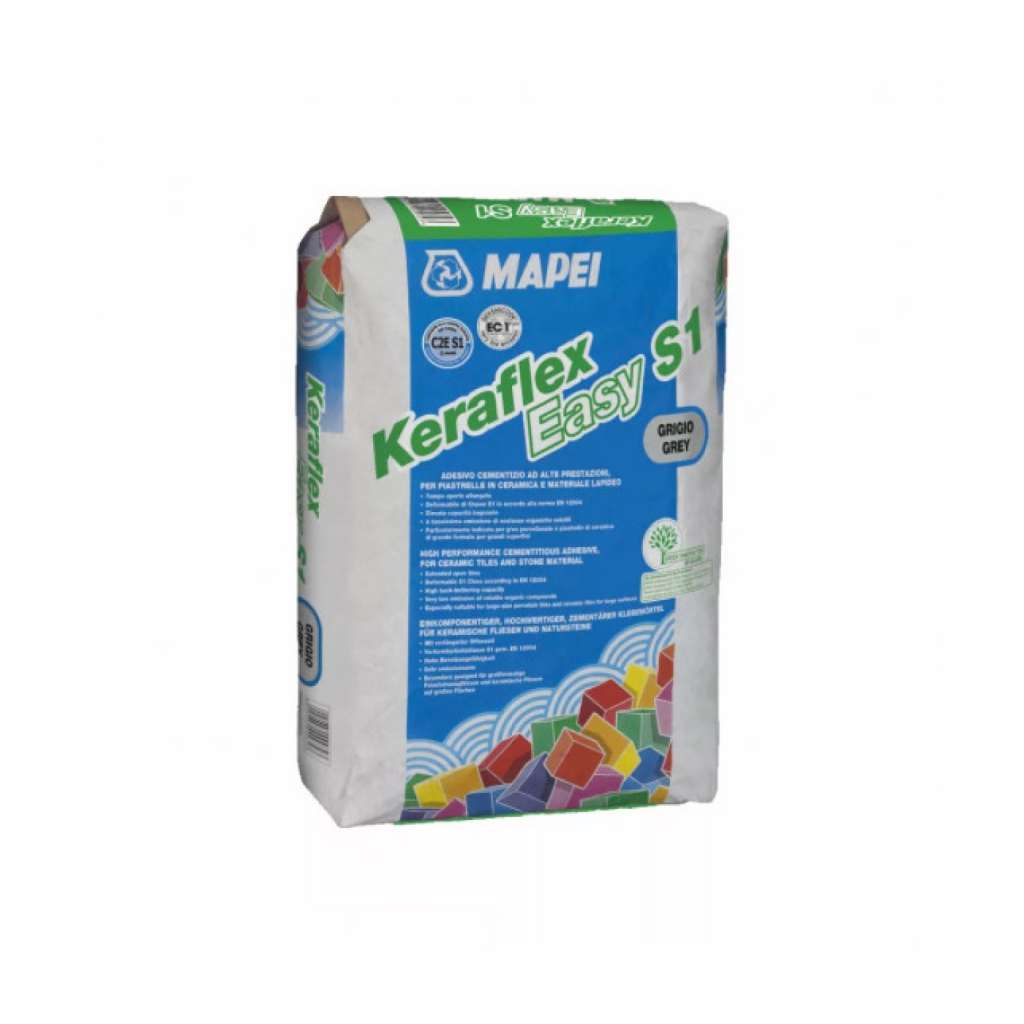 A KERAFLEX EASY S1 ZERO egy szürke vagy fehér cementkötésű, alakváltozásra képes, könnyen felhordható ragasztó, ideális kerámia burkolólapok, kő anyagok és mozaikok fektetéséhez, különösen javasolt nagy formátumú burkolólapok nagy padlófelületre ragasztásához.